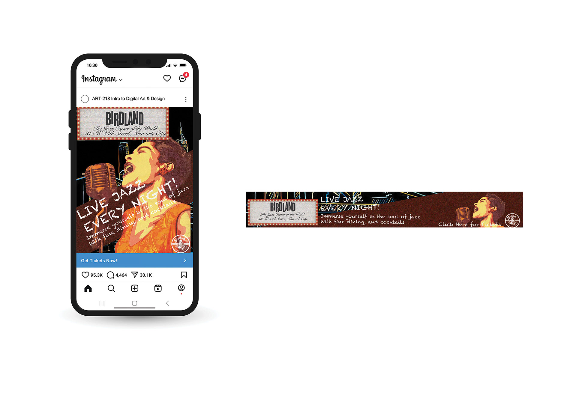 This project explored how multiple images can work together to create an effective advertisement. I designed a billboard for the jazz club Birdland, combining the singer Billie Holiday, drawings of skyscrapers in the background, and a theater neon sign using Photoshop. These elements capture the venue’s atmosphere while experimenting with composition and layering, and the project included variations for Instagram, print, and a website ad sponsor.